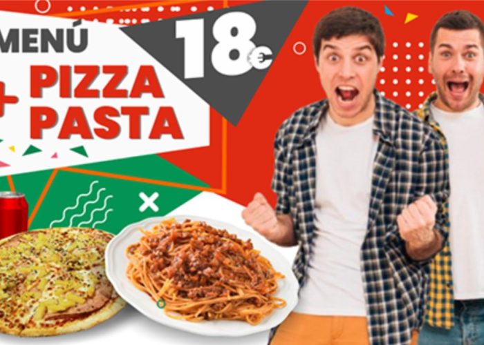 Menú Pizza Pasta1 Pizza a elegir, a Pasta a elegir y2 bebidas 50 cl.