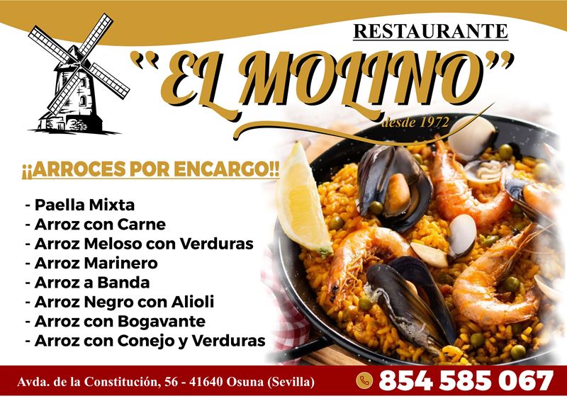 Nos sentimos orgullosos de nuestra nueva adquisición Restaurante El Molino. Un establecimiento con todas las comodidades necesarias para que nuestros clientes se sientan como en casa. Grandes salones para celebrar desde la comida más tradicional familiar a una celebración muy especial. En nuestra terraza también se encontrarán de lo más cómodos posible. Zona de fácil aparcamiento, acceso para personas con movilidad reducida y todo tipo de servicios y necesidades. Nuestra cocina cuenta con lo más tradicional andaluz unido con algunos toques especiales de la casa. No deje de visitarnos, estamos enteramente a su servicio.